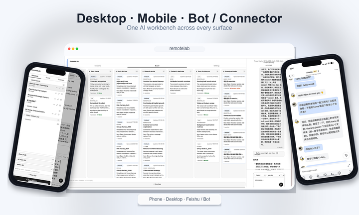 RemoteLab 想解决的,其实就是这一层 Agent 之上的问题。我们不打算去做一个单任务完成得比 CodeX 或者 CC 更好的 Agent,而是更想复用这些现成强执行器的能力,去完成 Agent 之间的调度编排,去帮助人做项目管理,同时给人一个多端介入的界面,让你不再被绑死在某一张工作桌前。既然我们已经更像一个管理者了,那其实也就没必要一直守在电脑边上。你可以随时随地用文字去指导它们的行为,不管你现在是在电脑上、手机上,还是在飞书或者其他平台的 Bot 上和 AI 联系,背后都应该还是同一套长期工作的系统。